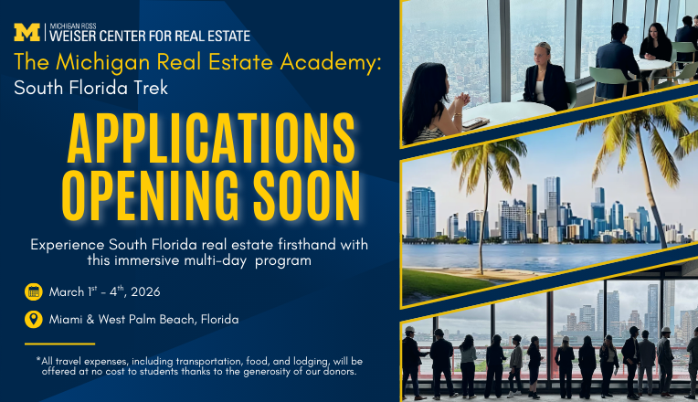 We’re selecting a group of undergrads to embark on a multi-day learning experience intended to introduce them to the real estate development ecosystem in South Florida. Students will have a chance to meet and learn from professionals working across the industry. This is also a great opportunity for you to grow your professional and U-M alumni network.